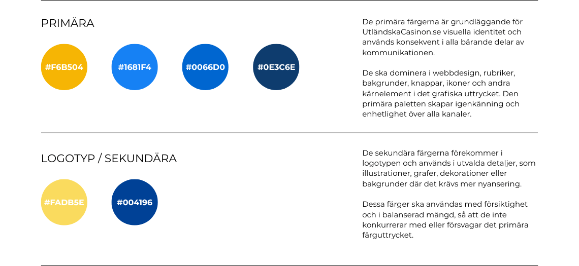 En varumärkesmanual är ett verktyg som samlar riktlinjer för hur vårt varumärke ska kommuniceras – visuellt, språkligt och strategiskt. Den fungerar som en gemensam referens för alla som arbetar med eller representerar UtländskaCasinon, internt och externt.
